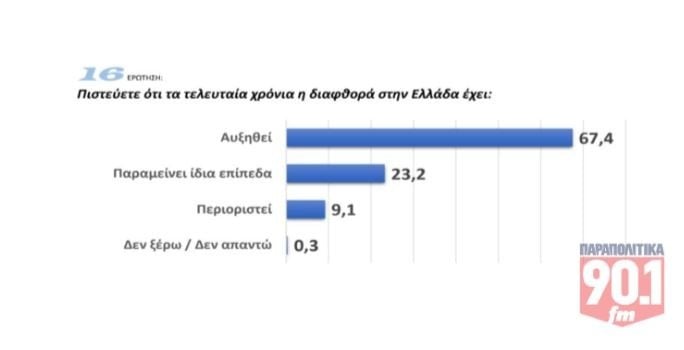 Οι 9 στους 10 ερωτηθέντες θεωρεί πως η διαφθορά έχει αυξηθεί (67,4%) ή είναι στα ίδια επίπεδα (23,2%) τα τελευταία χρόνια επί διακυβέρνησης της ΝΔ.