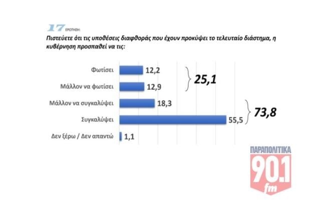 Στο ερώτημα τι προσπαθεί να κάνει η κυβέρνηση με τις υποθέσεις διαφθοράς 3 στους 4 (73,8%) λέει ότι προσπαθεί ή μάλλον προσπαθεί να την συγκαλύψει. Σίγουροι για συγκάλυψη δηλώνουν οι πολίτες σε ποσοστό 55,5%.