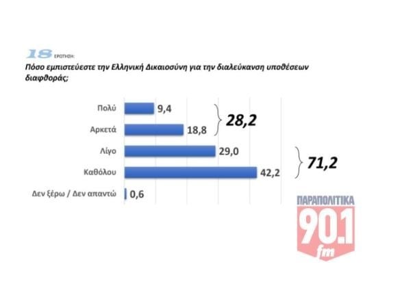 Κόλαφος για την ελληνική Δικαιοσύνη η δημοσκόπηση. Στο ερώτημα πόσο την σε θέματα διαφθοράς, το 71,2% λέει «καθόλου» ή «λίγο». Μονοψήφιο ποσοστό για εκείνους που έχουν «πολύ» εμπιστοσύνη.