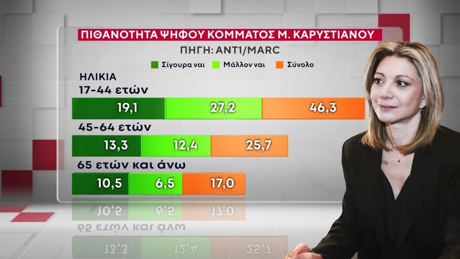 Την Μαρία Καρυστιανού θα ψήφιζε το 35,7% των γυναικών και το 29,1% των ανδρών. Οι περισσότερες ψήφοι προέρχεται από τις ηλικίες 17-44 ετών με το ποσοστό να φτάνει στο 46,3%. Το 25,7% προέρχεται από τις ηλικίες 45-64 ετών και το 17% από 65 ετών και άνω.
