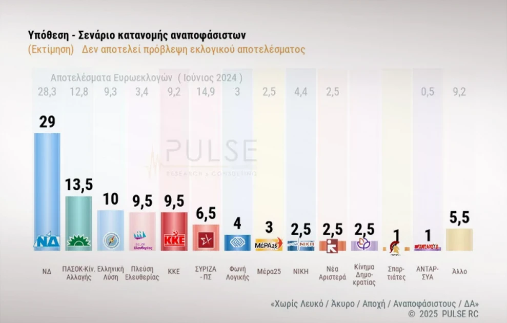 Στο σενάριο κατανομής αναποφάσιστων, η ΝΔ συγκεντρώνει 29% και ακολουθούν ΠΑΣΟΚ με 13,5%, Ελληνική Λύση με 10%, Πλεύση Ελευθερίας και ΚΚΕ από 9,5%, ΣΥΡΙΖΑ με 65% και Φωνή Λογικής με 4%. Σε αυτό το σενάριο στη Βουλή μπαίνει και το ΜέΡΑ25 με 3%.