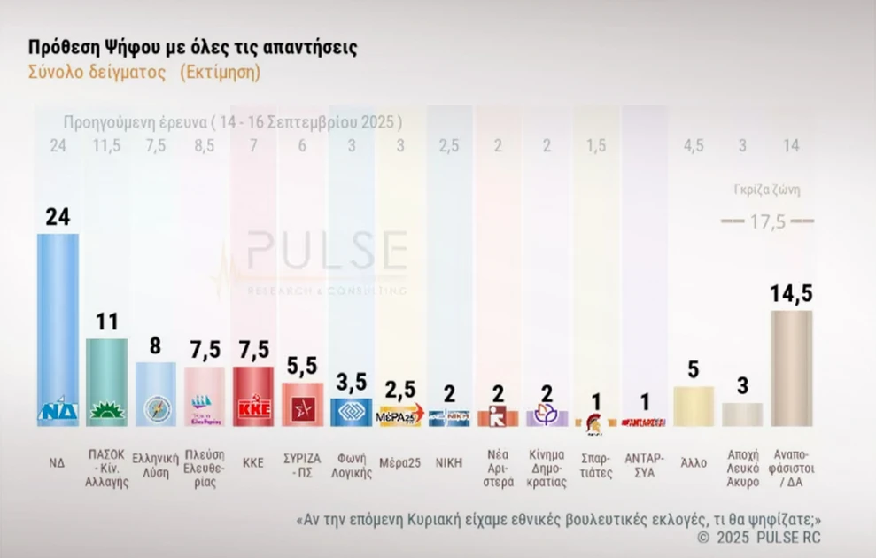 Από εκεί και πέρα, με βάση την εν λόγω δημοσκόπηση, η Νέα Δημοκρατία καταγράφει προβάδισμα 15,5 μονάδων έναντι του ΠΑΣΟΚ. Συγκεκριμένα, η ΝΔ συγκεντρώνει στην πρόθεση ψήφου 24% και ακολουθούν ΠΑΣΟΚ με 11%, Ελληνική Λύση με 8%, Πλεύση Ελευθερίας και ΚΚΕ από 7,5%, ΣΥΡΙΖΑ με 5,5% και Φωνή Λογικής με 3,5%.