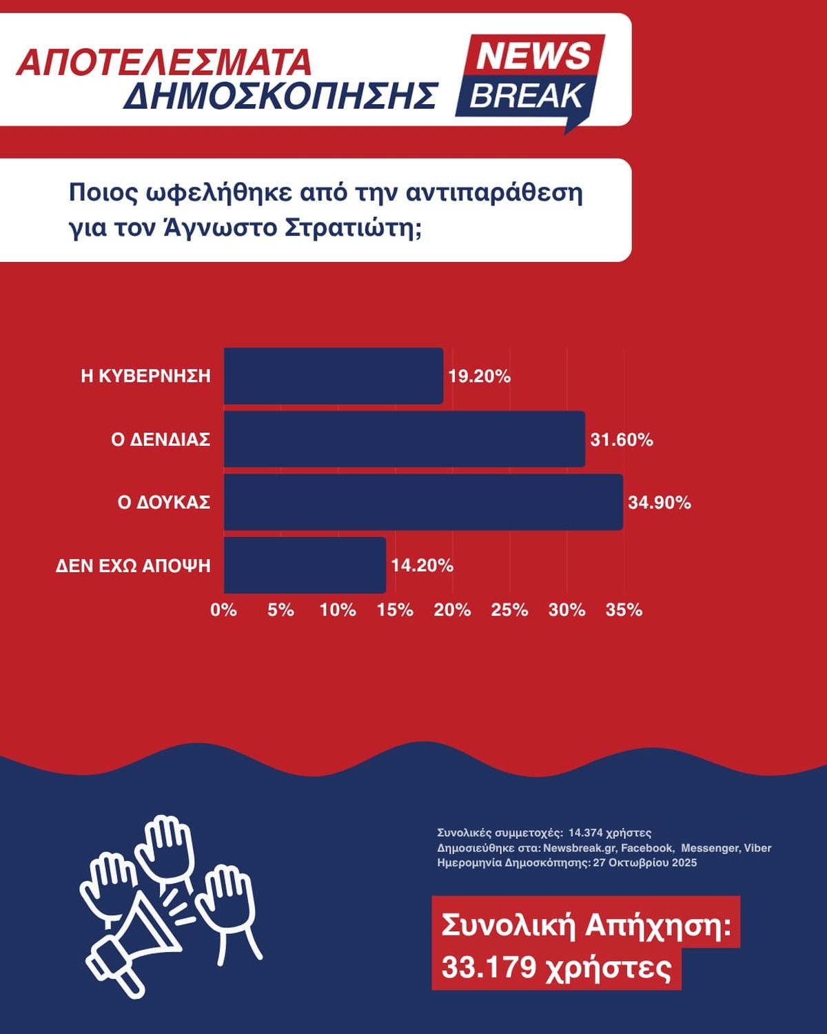 Η συμμετοχή ήταν εντυπωσιακή: 14.374 χρήστες ψήφισαν, ενώ η συνολική απήχηση της δημοσκόπησης έφτασε τους 33.179 χρήστες.
