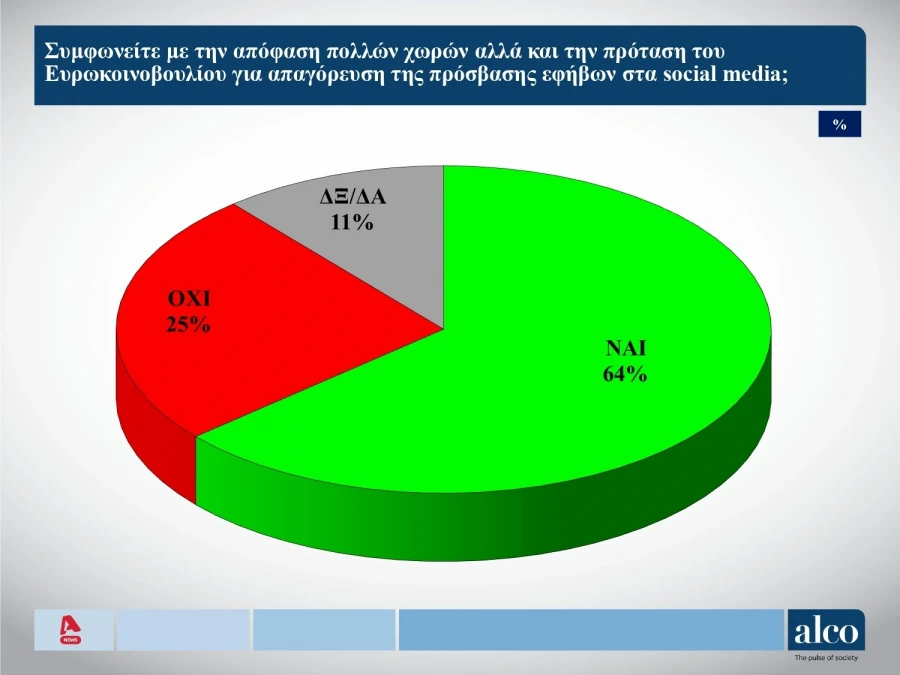Στο ερώτημα «Συμφωνείτε με την απόφαση πολλών χωρών αλλά και την πρόταση του Ευρωκοινοβουλίου για απαγόρευση της πρόσβασης εφήβων στα social media;», οι απαντήσεις των πολιτών στο δεύτερο μέρος της δημοσκόπησης της Alco είναι ξεκάθαρο «ναι», με ποσοστό 64% και ακολουθεί το «όχι» με 25%.