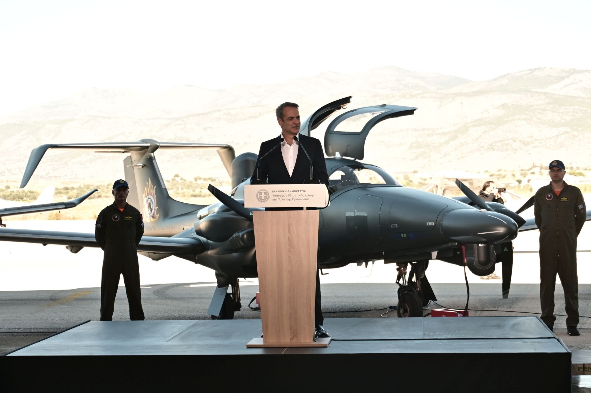 «Με πολύ μεγάλη χαρά υποδεχόμαστε σήμερα τα πρώτα ιδιόκτητα αεροσκάφη στην ιστορία του Πυροσβεστικού Σώματος», ανέφερε ο πρωθυπουργός. Τόνισε ότι πρόκειται για μία συμβολική στιγμή καθώς αυτή η τελετή σηματοδοτεί το πρώτο βήμα εφαρμογής και υλοποίησης του πιο φιλόδοξου προγράμματος αναβάθμισης των εναερίων μέσων Πολιτικής Προστασίας στην ιστορία της πατρίδας μας.