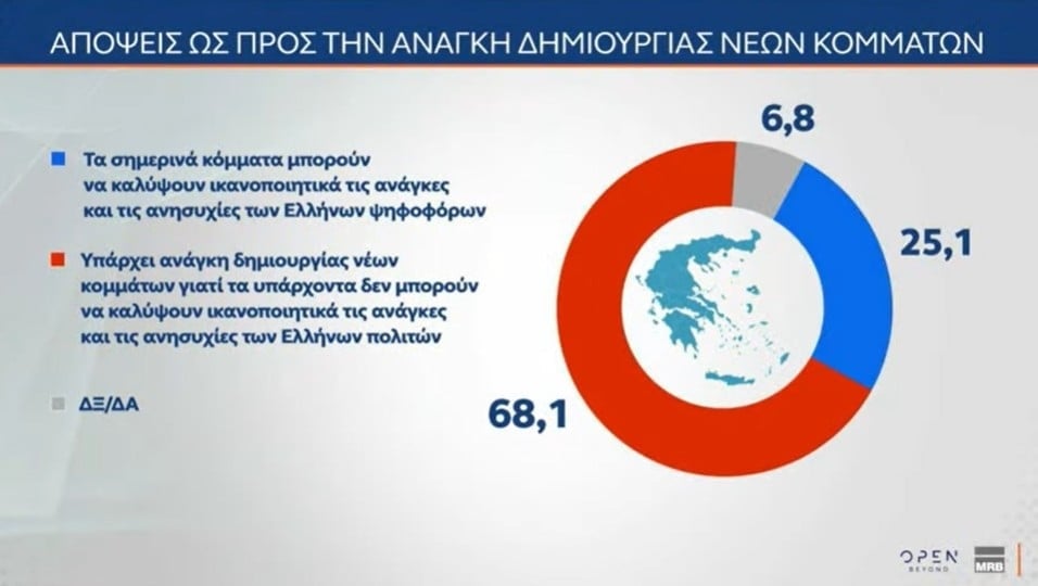 Το 68,1% βλέπει ανάγκη δημιουργίας νέων κομματικών φορέων, διότι οι υπάρχοντες δεν μπορούν να καλύψουν ικανοποιητικά τις ανάγκες και τις ανησυχίες των Ελλήνων πολίτων. Το 25,1% θεωρεί ότι τα υφιστάμενα κόμματα μπορούν.