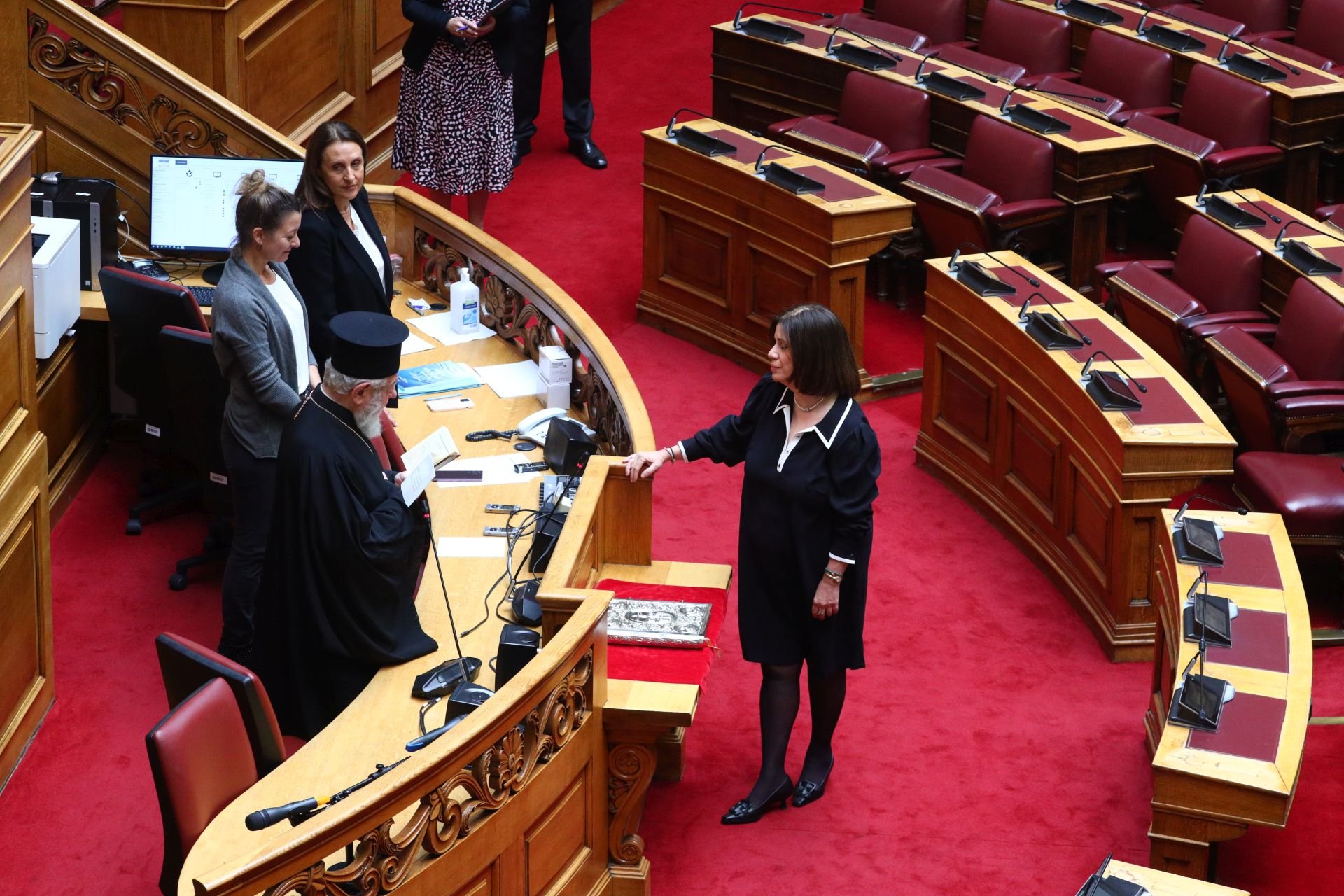 «Αξία στην αποστολή σας» ήταν ευχή του ιερέα, ενώ ο προεδρεύων Οδυσσέας Κωνσταντινόπουλος είπε στη νέα βουλευτή της Α Αθηνών «να ευχηθούμε καλή δύναμη στη νέα συνάδελφο».