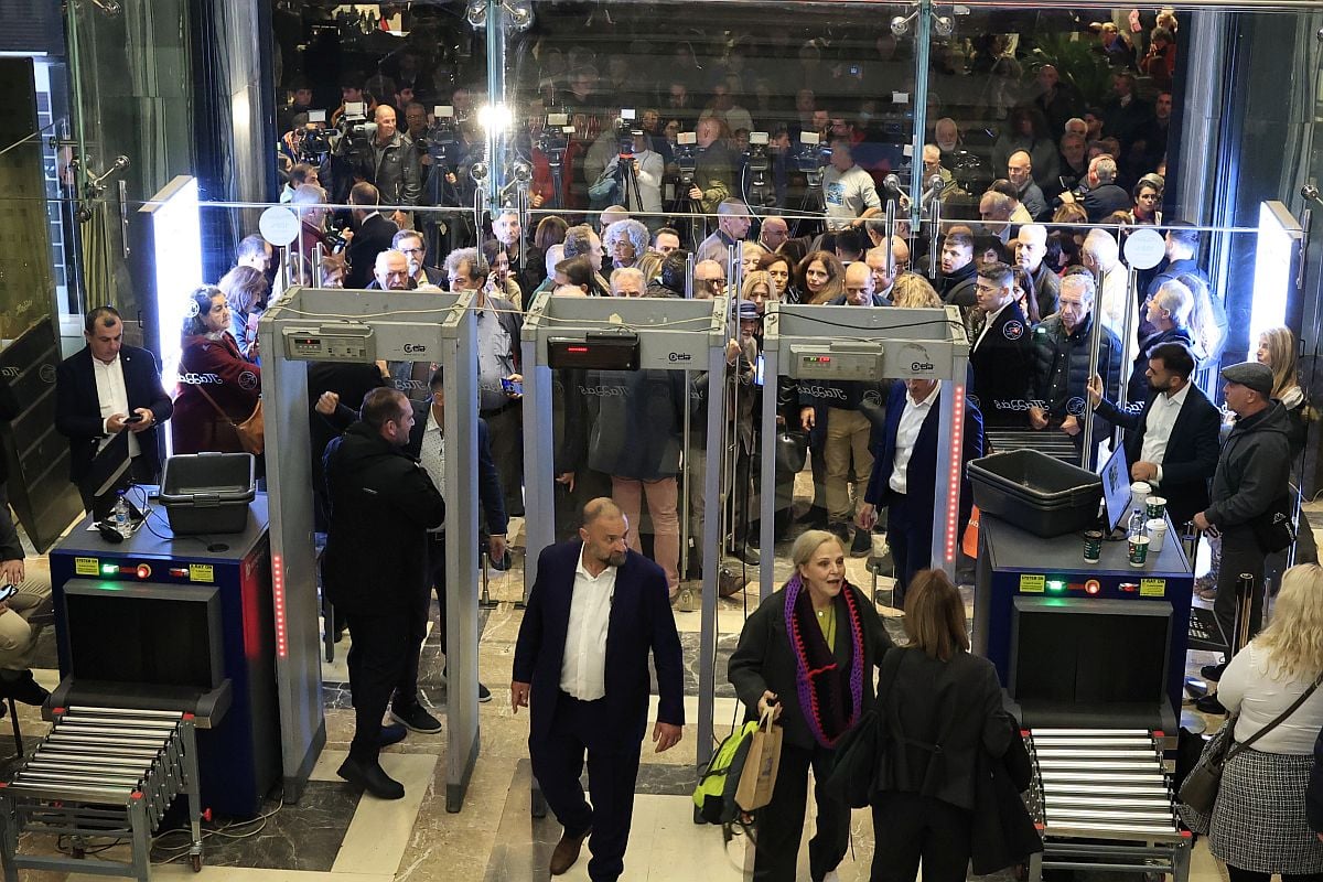 Η πλατεία έχει ήδη γεμίσει και οι πόρτες του θεάτρου έκλεισαν, με αποτέλεσμα ακόμη και βουλευτές που έφτασαν αργότερα να αναζητούν θέση στην εξώστη…
