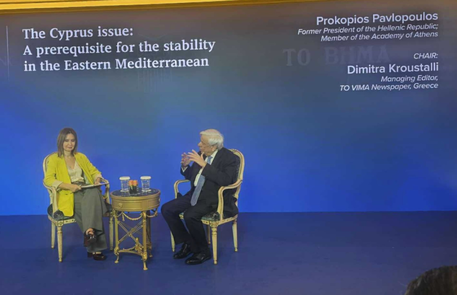 Συνέντευξη με θέμα «Η επίλυση του Κυπριακού Ζητήματος ως προϋπόθεση για την εμπέδωση της σταθερότητας στην Ανατολική Μεσόγειο», παραχώρησε ο Προκόπης Παυλόπουλος στο πλαίσιο συνεδρίου με τίτλο «Η Ανατολική Μεσόγειος αλλάζει» που συνδιοργάνωσαν το «The Council», το «Delphi Economic Forum» και η εφημερίδα «Το Βήμα».
