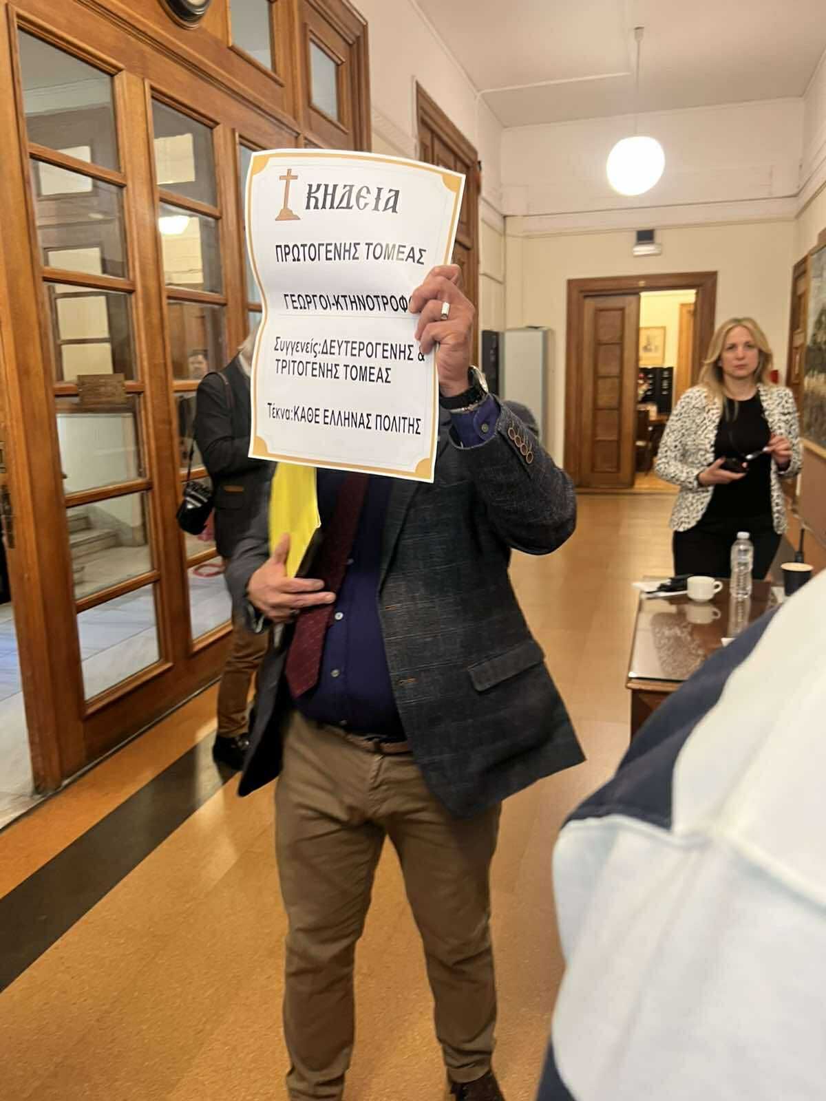 Με κηδειόχαρτο από τα μπλόκα εμφανίστηκε ο βουλευτής της Ελληνικής Λύσης Κώστας Μπούμπας – μέλος της Εξεταστικής Επιτροπής, ενόψει της εξέτασης του «Φραπέ».