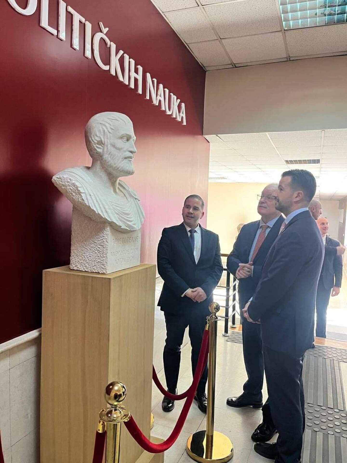 Στη συνέχεια βρέθηκαν στο Πανεπιστήμιο όπου υπάρχει μια προτομή του Αριστοτέλη, δώρο της Ελληνικής Πρεσβείας, με γραμμένη στα ελληνικά την φράση «Άνθρωπος ζώον λόγον έχει».