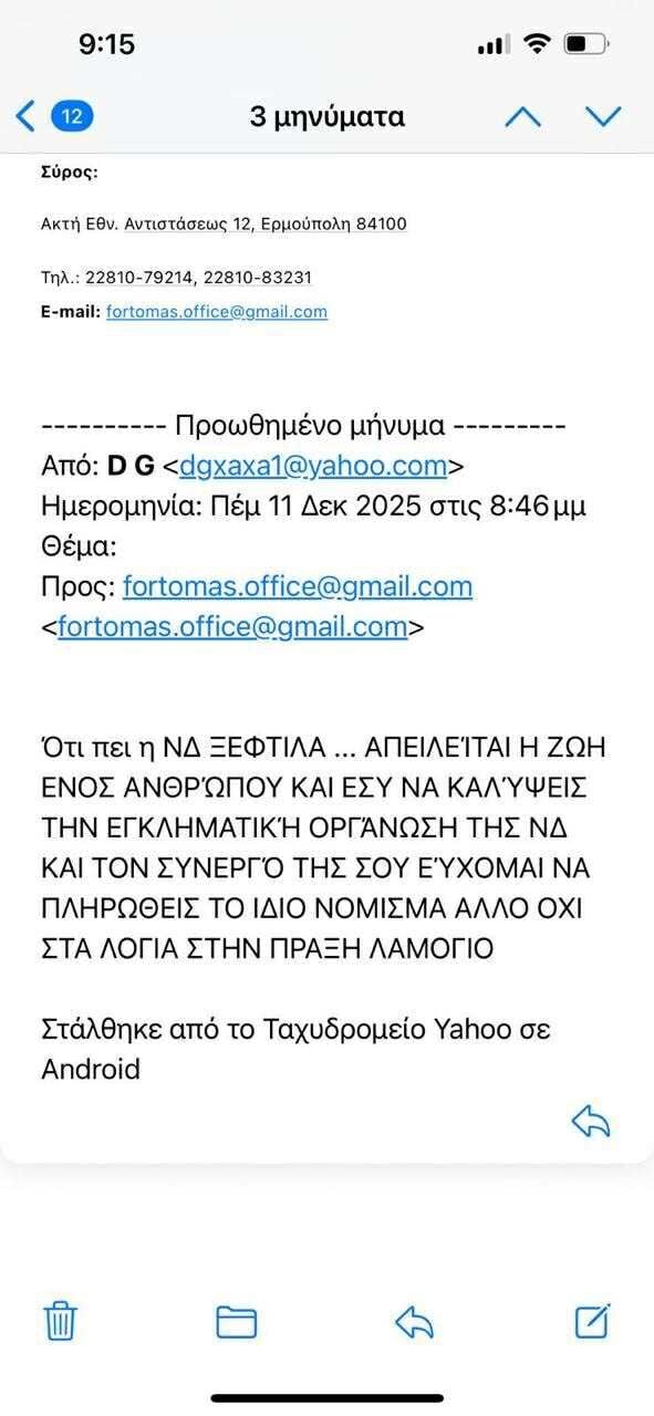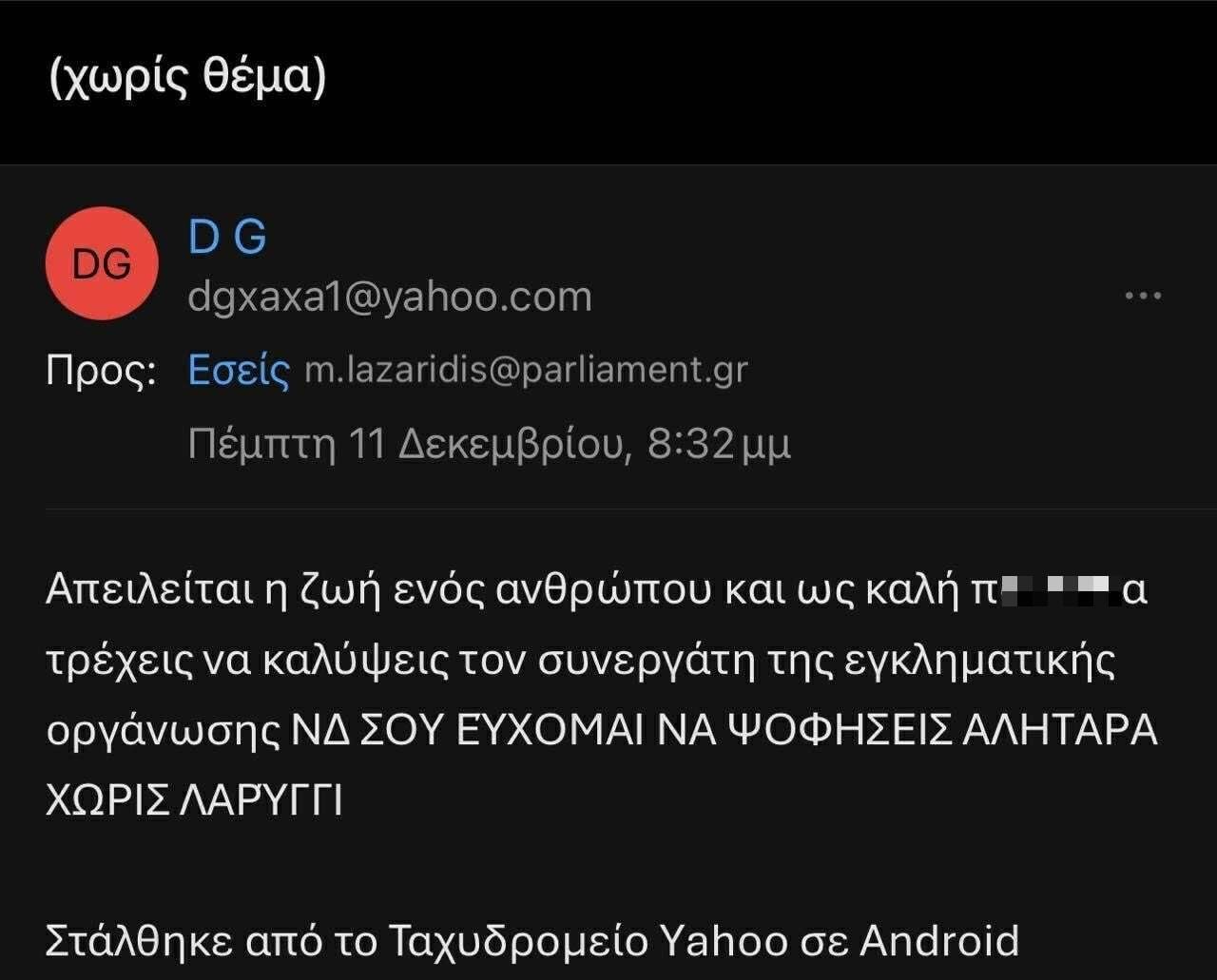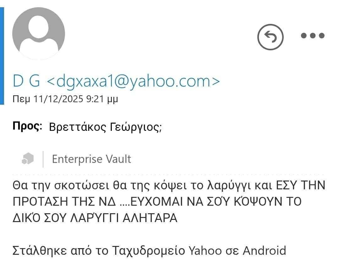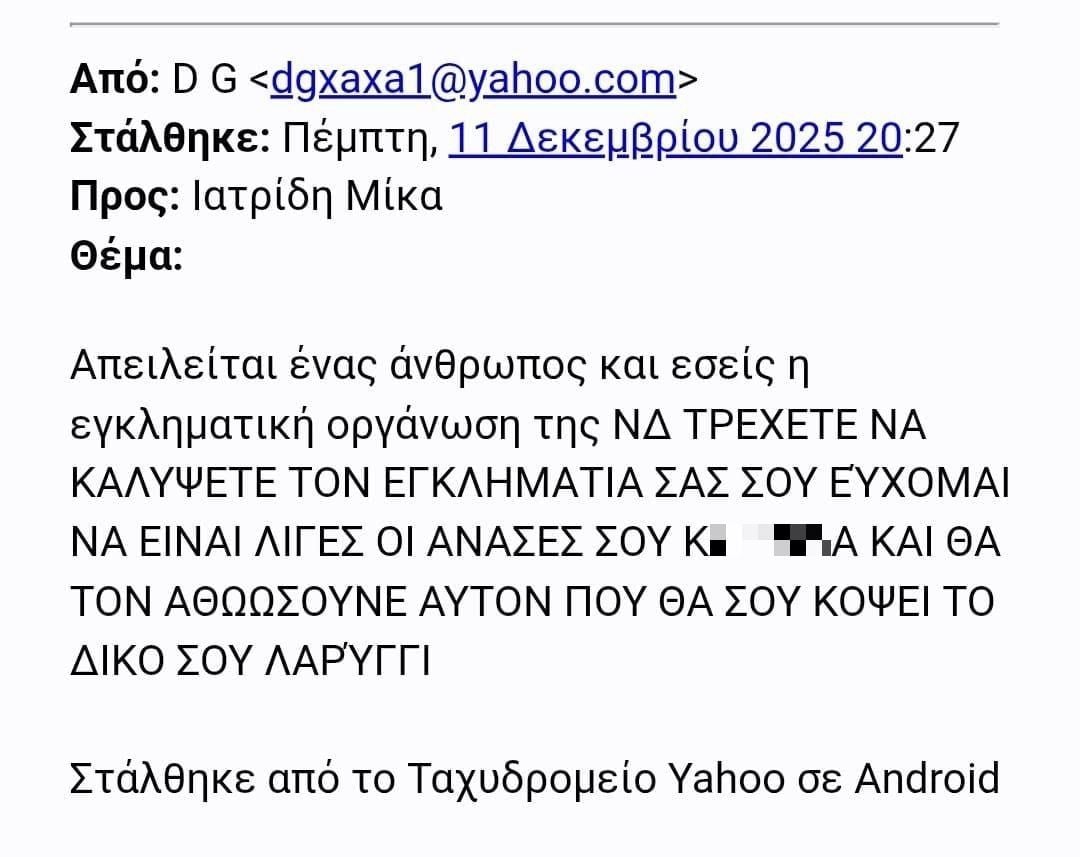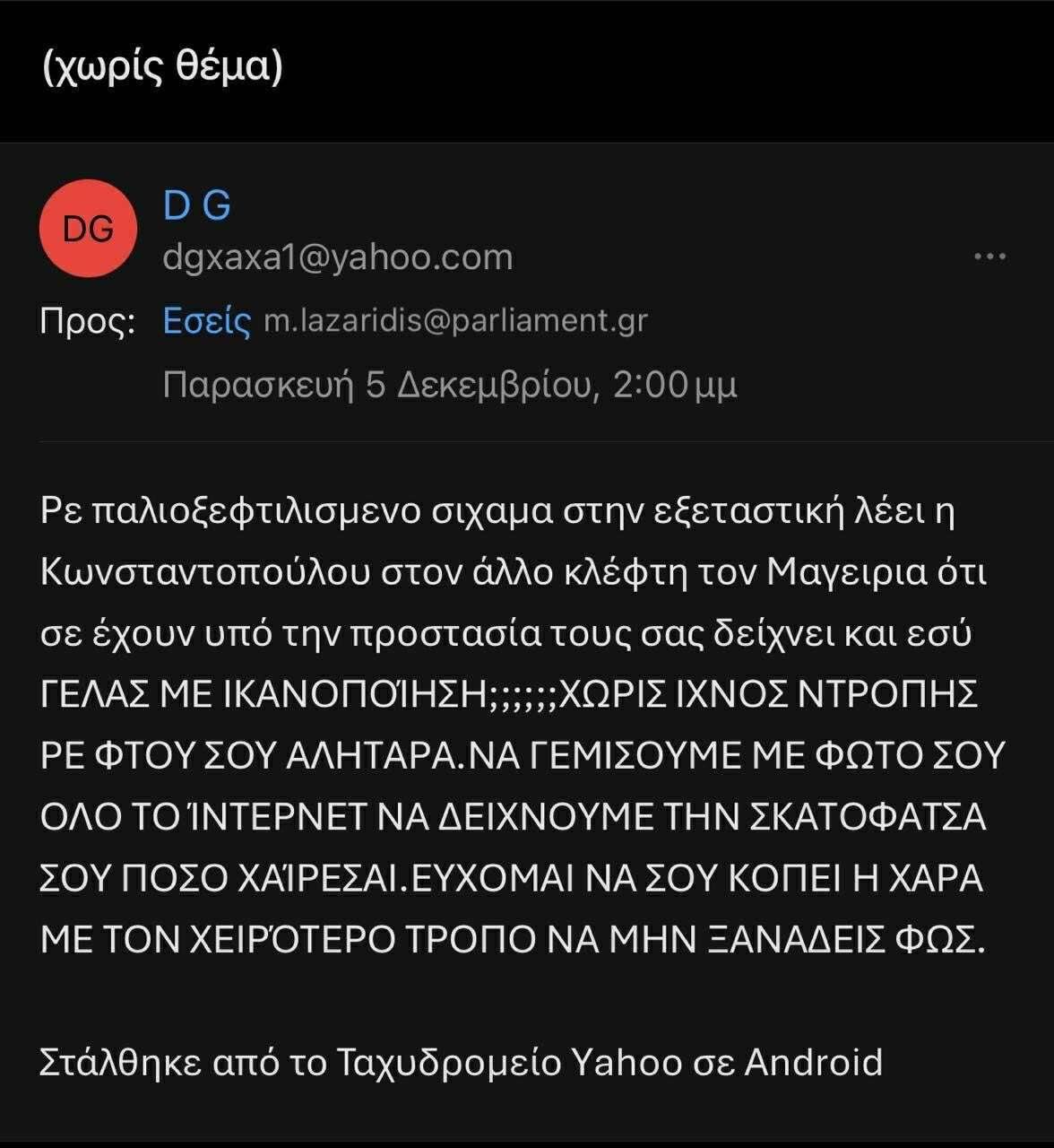Πηγές της ΝΔ «έδειξαν» την πρόεδρο της Πλεύσης Ελευθερίας, κατηγορώντας την ότι βρίσκεται πίσω από την αποστολή τους. «Εάν συμβεί το παραμικρό σε βουλευτή της Νέας Δημοκρατίας, η πολιτική και ηθική ευθύνη θα βαραίνει πλήρως και προσωπικά την κυρία Ζωή Κωνσταντοπούλου. Η διαρκής τοξική ρητορική της και η θεσμική της εκτροπή λειτουργούν ως πολλαπλασιαστής τέτοιων απειλών», αναφέρουν πηγές της ΝΔ και προσθέτουν ότι «συνεργάτες της κυρίας Κωνσταντοπούλου κινούνται συστηματικά έξω από την αίθουσα της Εξεταστικής Επιτροπής, παρακολουθώντας βουλευτές και επιχειρώντας να υποκλέψουν ιδιωτικές συνομιλίες. Οι πρακτικές αυτές παραπέμπουν σε σκοτεινές περιόδους και είναι απολύτως ασύμβατες με το Κοινοβούλιο».