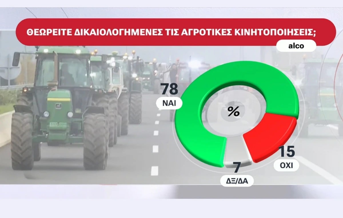 Ειδικότερα, στο ερώτημα «Θεωρείτε δικαιολογημένες τις αγροτικές κινητοποιήσεις» το 78% απαντά «ΝΑΙ», έναντι του μόλις 15% που απαντά «ΟΧΙ».