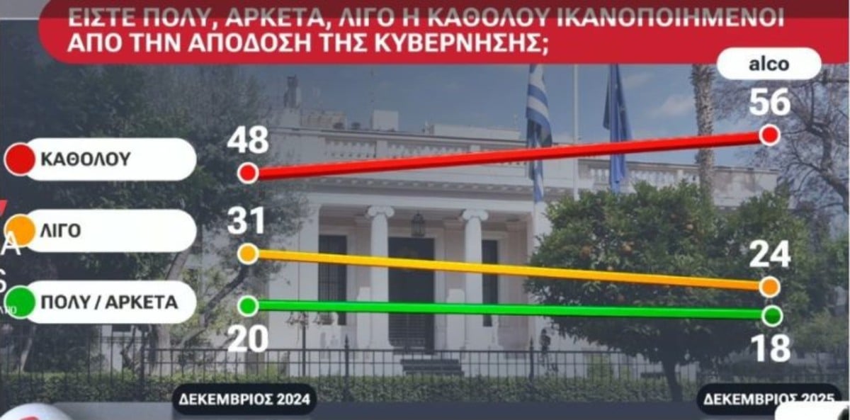 Σύμφωνα με νέα δημοσκόπηση της ALCO, αυτή τη φορά για λογαριασμό του ALPHA, στην συντριπτική πλειοψηφία τους οι ερωτηθέντες δηλώνουν δυσαρεστημένοι με την απόδοση της κυβέρνησης, κατακεραυνώνοντας στο σύνολό τους τις πολιτικές της ΝΔ και αποδομώντας το success story που πασχίζει να «χτίσει» ο Κυριάκος Μητσοτάκης, κυρίως μέσω Ευρώπης.