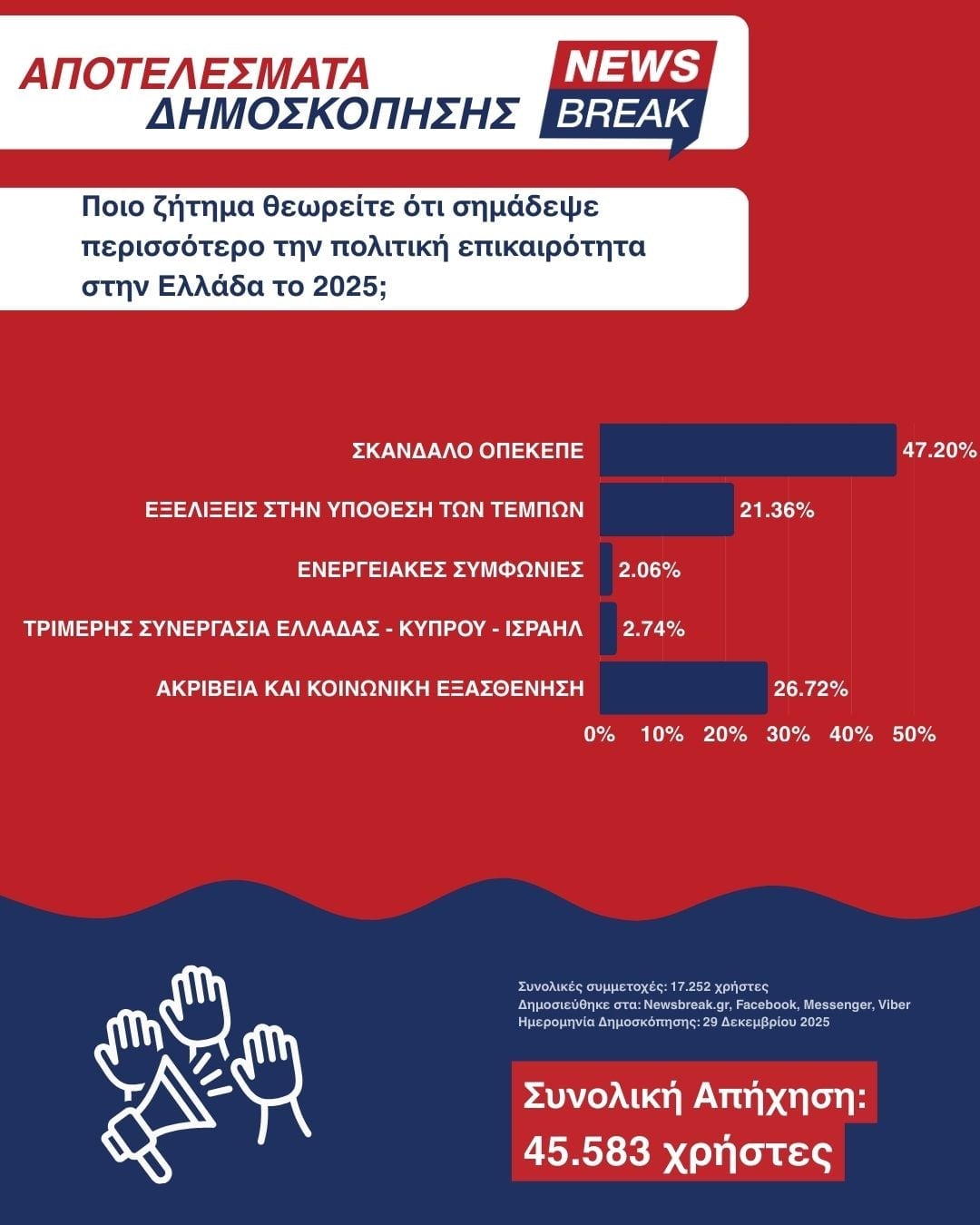 Η ανταπόκριση του κοινού υπήρξε ιδιαίτερα έντονη, με 17.252 πολίτες να συμμετέχουν ενεργά, ενώ η συνολική απήχηση ξεπέρασε τους 45.583 χρήστες, μέσα από τη δημοσίευση στο newsbreak.gr, καθώς και στα Facebook, Instagram, Viber και YouTube.