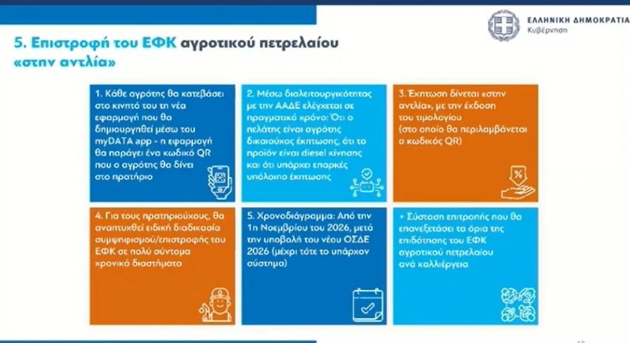 Όπως περιέγραψε, κάθε αγρότης θα κατεβάσει στο κινητό του τη νέα εφαρμογή που θα δημιουργηθεί μέσω του myDATA app – η εφαρμογή θα παράγει ένα κωδικό QR που ο αγρότης θα δίνει στο πρατήριο. Μέσω διαλειτουργικότητας με την ΑΑΔΕ θα ελέγχεται σε πραγματικό χρόνο ότι ο πελάτης είναι αγρότης, δικαιούχος έκπτωσης, ότι το προϊόν είναι diesel κίνησης και ότι υπάρχει επαρκές υπόλοιπο έκπτωσης. Η έκπτωση δίνεται «στην αντλία», με την έκδοση του τιμολογίου (στο οποίο θα περιλαμβάνεται ο κωδικός QR). Για τους πρατηριούχους, θα αναπτυχθεί ειδική διαδικασία συμψηφισμού/επιστροφής του ΕΦΚ σε πολύ σύντομα χρονικά διαστήματα. «Υλοποιείται έτσι το εν λόγω πολυετές αίτημα» είπε ο Θ. Πετραλιάς.