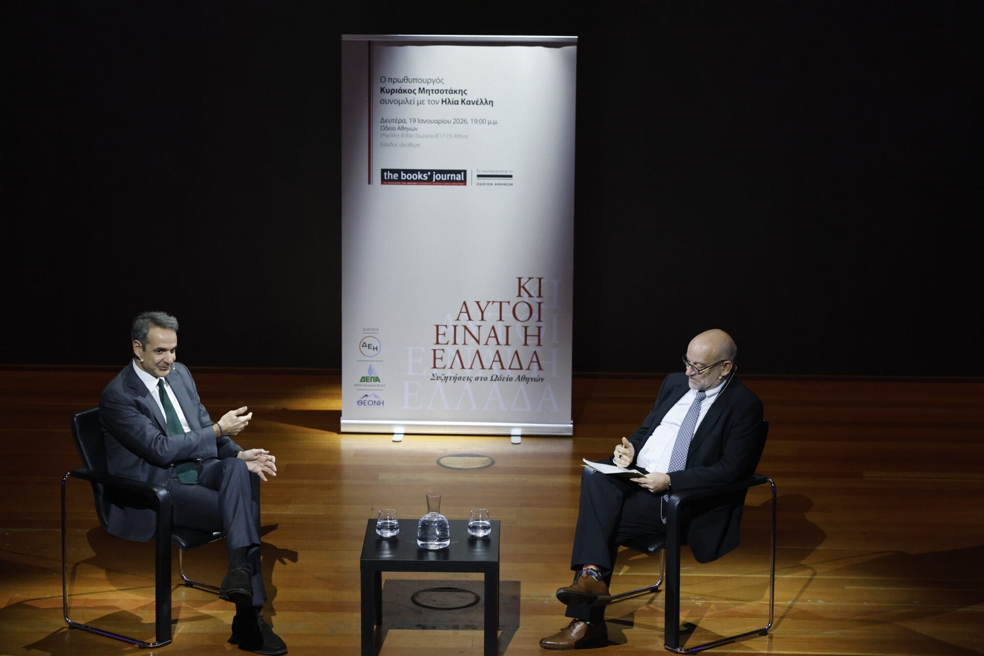 Σε ζωντανή μετάδοση πραγματοποιείται η συζήτηση του Πρωθυπουργού Κυριάκου Μητσοτάκη με τον δημοσιογράφο και συγγραφέα Ηλία Κανέλλη, στο ιστορικό Ωδείο Αθηνών, στο πλαίσιο του πρώτου κύκλου δημόσιων εκδηλώσεων με τίτλο «Κι αυτοί είναι η Ελλάδα – Συζητήσεις στο Ωδείο Αθηνών».