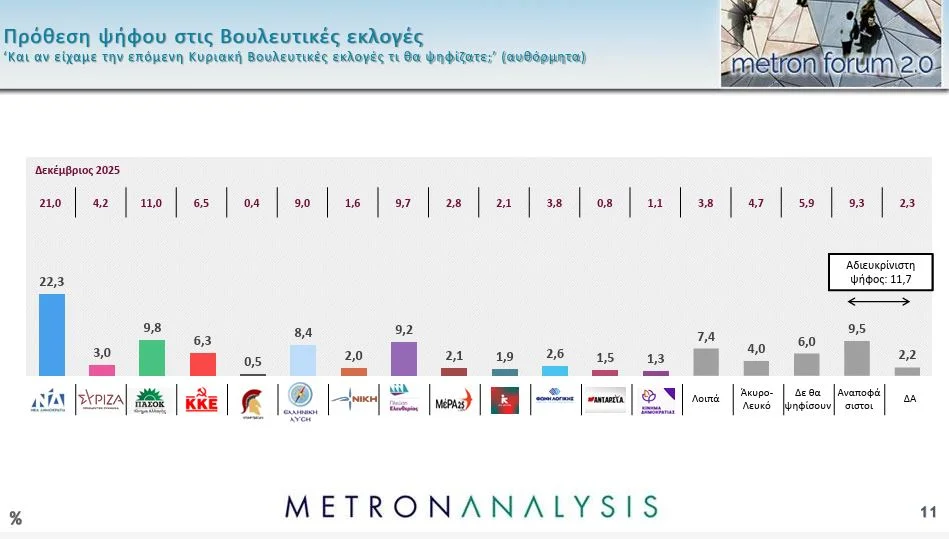Η Νέα Δημοκρατία εξακολουθεί να έχει προβάδισμα έναντι του ΠΑΣΟΚ, με 16 μονάδες διαφορά, σύμφωνα με την δημοσκόπηση της Metron Analysis.