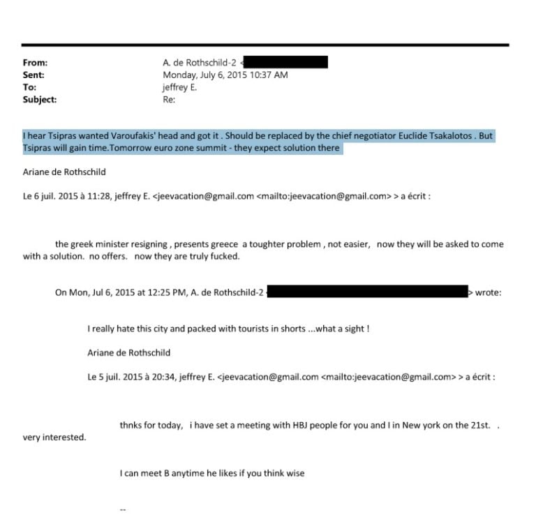 Ανάμεσα στα γεγονότα που προκύπτουν από αυτά τα emails περιλαμβάνονται μεταξύ άλλων, συζητήσεις μεταξύ του Έπσταϊν και της επικεφαλής της Edmond de Rothschild Group, Αριάν ντε Ρότσιλντ, σχετικά με το ελληνικό δημοψήφισμα του Ιουλίου 2015 και τον τρόπο με τον οποίο η παραίτηση του τότε υπουργού Οικονομικών Γιάνη Βαρουφάκη επηρέαζε τις διαπραγματεύσεις με τους ευρωπαίους εταίρους.