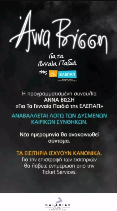 Η Άννα Βίσση προσθέτει: «Η νέα ημερομηνία θα ανακοινωθεί άμεσα. Ευχαριστώ για το συνεχές ενδιαφέρον και ενθουσιασμό σας».
