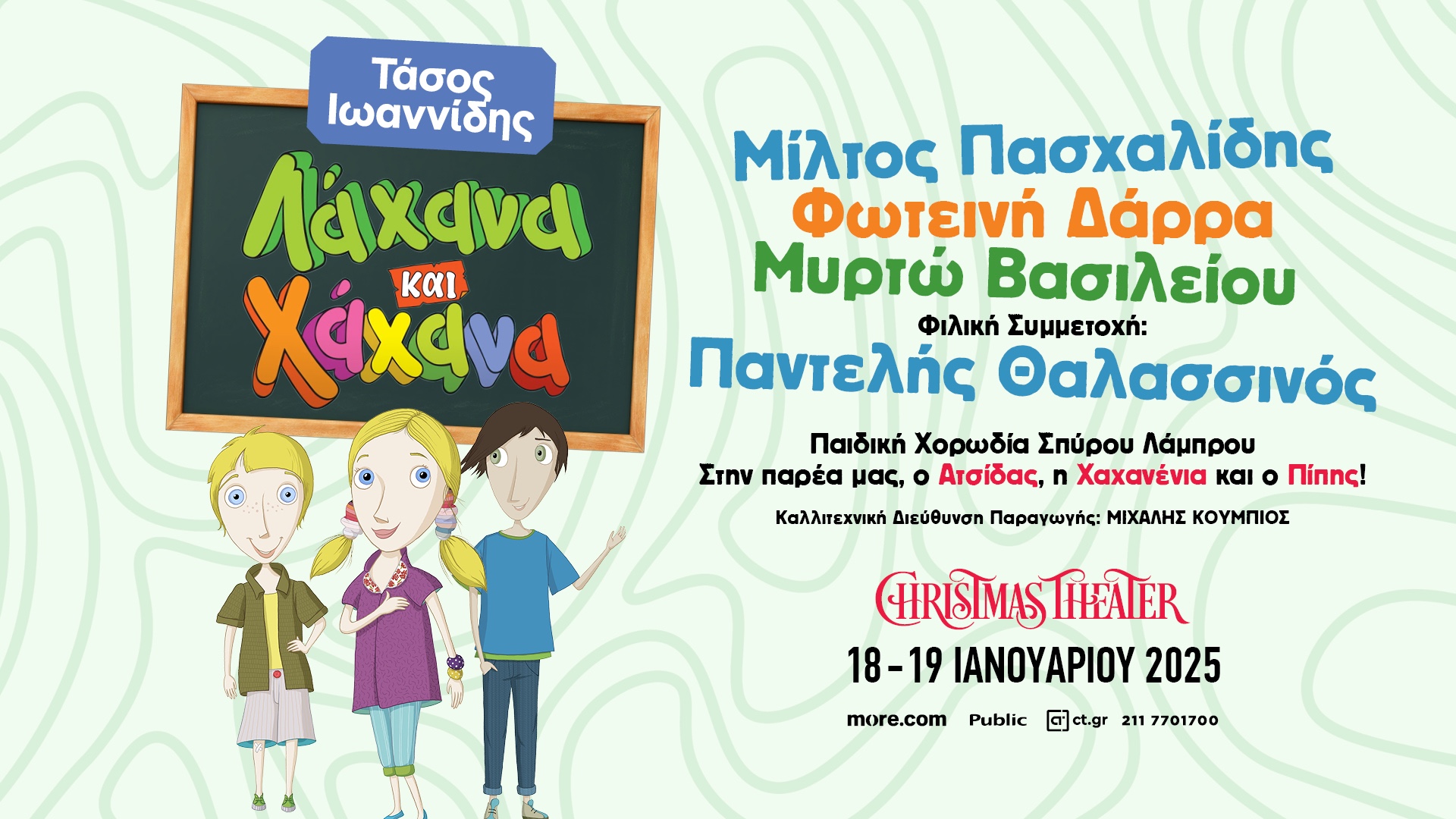 Τα πιο αγαπημένα τραγούδια από τα «Λάχανα και Χάχανα» του Τάσου Ιωαννίδη έρχονται στο Christmas Theater! Το Σάββατο 18 Ιανουαρίου στις 4 το απόγευμα και την Κυριακή 19 Ιανουαρίου στις 12 το μεσημέρι.