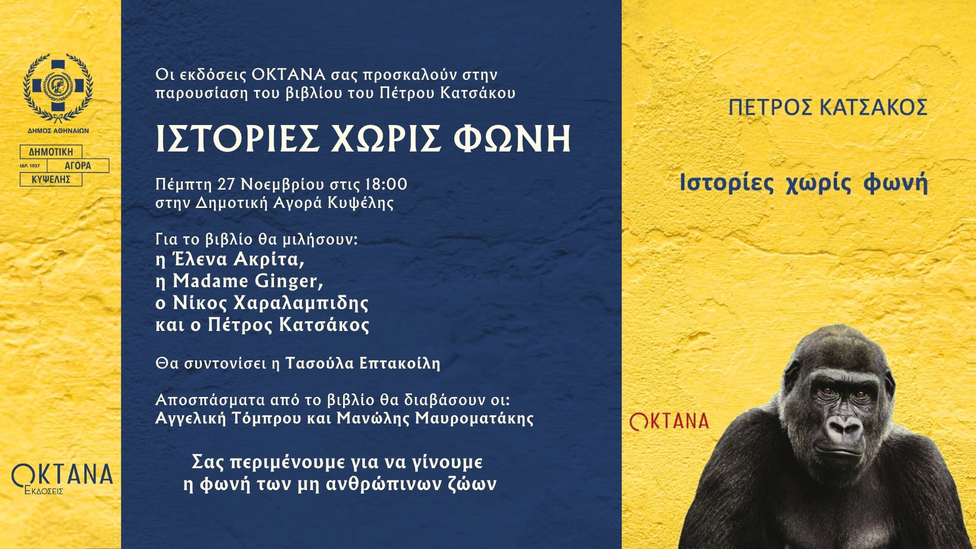 Οι εκδόσεις «ΟΚΤΑΝΑ» παρουσιάζουν το νέο βιβλίο του Πέτρου Κατσάκου«Ιστορίες χωρίς φωνή», την Πέμπτη 27 Νοεμβρίου στις 18:00 στη Δημοτική Αγορά Κυψέλης. Πρόκειται για μια εκδήλωση με κοινωνικό και συναισθηματικό αποτύπωμα, αφιερωμένη στην ευαισθητοποίηση απέναντι στα μη ανθρώπινα όντα και στη φωνή που τους οφείλουμε ως άνθρωποι.