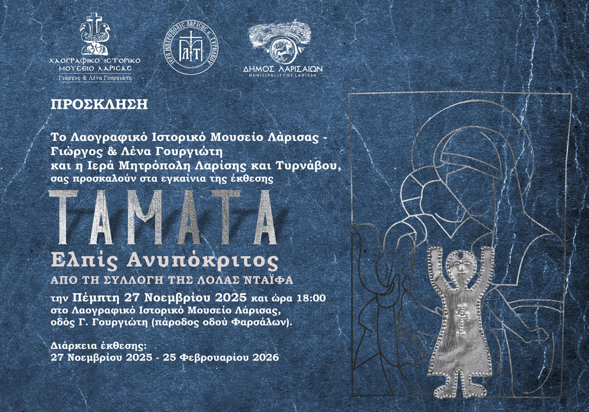 Μια ιδιαίτερη έκθεση με προσωπικό υλικό από την ιδιωτική συλλογή της Λόλας Νταϊφά εγκαινιάζεται την ερχόμενη Πέμπτη 27 Νοεμβρίου στο Λαογραφικό Ιστορικό Μουσείο Λάρισας «Γιώργος και Λένα Γουργιώτη», σε συνεργασία με την Ιερά Μητρόπολη Λαρίσης και Τυρνάβου. Η έκθεση έχει τίτλο «Τάματα, Ἐλπίς Ἀνυπόκριτος».
