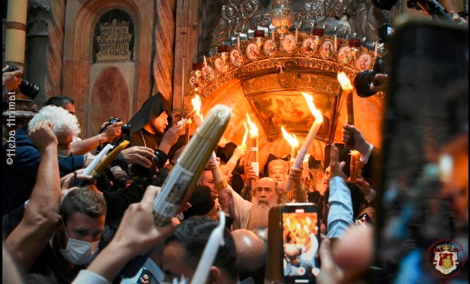Οι καμπάνες ήχησαν χαρμόσυνα και ο Πατριάρχης Ιεροσολύμων Θεόφιλος Γ’ βγήκε από τον Πανάγιο Τάφο κρατώντας το Άγιο Φως, με τον Ιερό Ναό της Αναστάσεως να φωτίζεται αστραπιαία!