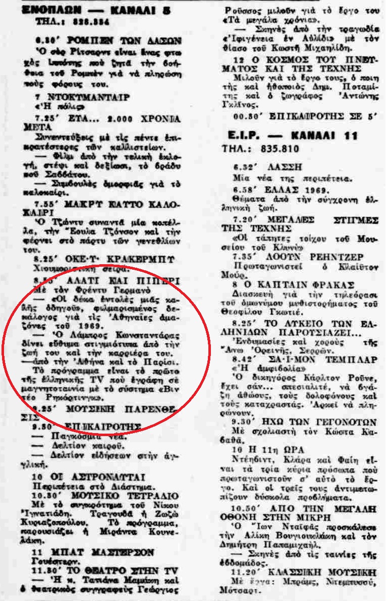 Και για του λόγου το αληθές από την ίδια εφημερίδα παρουσιάζουμε από το τηλεοπτικό πρόγραμμα της ημέρας (Δευτέρα 16 Ιουνίου 1969) το θεματολόγιο της πρώτης βιντεοσκοπημένης εκπομπής στην ελληνική τηλεόραση.
