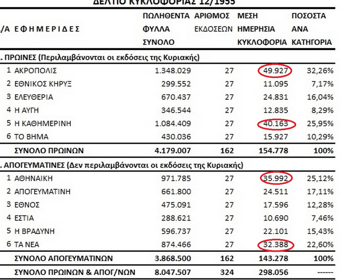 Αναζητήσαμε την αλήθεια, που όπως συνήθως συμβαίνει βρίσκεται κάπου στη μέση. Σύμφωνα με τα επίσημα στοιχεία της Ένωσης Ιδιοκτητών Ημερησίων Εφημερίδων το Νοέμβριο του 1955 η Αθηναϊκή είχε όντως την πρώτη κυκλοφορία μεταξύ των απογευματινών, μόνο, εφημερίδων με ΤΑ ΝΕΑ να την ακολουθούν κι αμέσως μετά την Απογευματινή που κι αυτή είχε κυκλοφορήσει πρόσφατα και τέταρτη την Βραδυνή. Υπήρχε όμως μια διαφορά. Ο κόσμος, ειδικά στην περιφέρεια, δεν αγόραζε την εφημερίδα του το πρωί επειδή πολύ απλά έφθαναν στις μακρινές από την Αθήνα περιοχές το μεσημέρι, ενώ οι απογευματινές την επόμενη μέρα. Έτσι η περιβόητη πρωτιά γινόταν 3η θέση αφού η Ακρόπολις και η Καθημερινή, πρωινές εκδόσεις, πουλούσαν περισσότερα φύλλα.