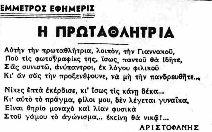Στον «Ασύρματο» διαβάζουμε ένα σατιρικό έμμετρο του Αλέκου Σακελλάριου που το υπέγραψε ως «Αριστοφάνης».