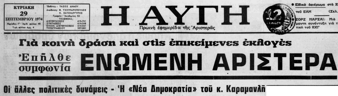 Την ίδια μέρα αναγγέλεται και η δημιοργία της Ενωμένης Αριστεράς. Ο Ριζοσπάστης έχει πρώτο θέμα την είδηση, αλλά δεν αναφέρεται το νέο κόμμα. Ασχολείται με επικριτικό άρθρο στην πρώτη σελίδα την Τρίτη 1η Οκτωβρίου.