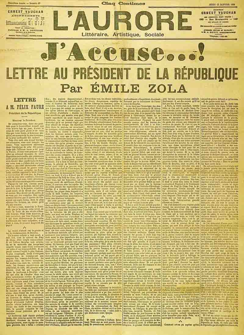 Τότε ήταν που παρενέβη ο συγγραφέας Εμίλ Ζολά, ο οποίος στις 13 Ιανουαρίου 1898 δημοσίευσε στην πρώτη σελίδα της εφημερίδας «L’ Aurore» το περίφημο «Κατηγορώ…!», μια ανοιχτή επιστολή προς τον Πρόεδρο της Δημοκρατίας. Ο Ζολά κατηγόρησε τον Στρατό ότι συγκάλυψε τη λανθασμένη καταδίκη του Ντρέιφους και αθώωσε τον Εστερχάζι με εντολή του Υπουργείου Στρατιωτικών. Παράλληλα, δήλωνε την απέχθειά του προς την υποκρισία και τον φανατισμό. Το τεύχος της εφημερίδας τυπώθηκε σε 300.000 αντίτυπα αντί των 30.000, που ήταν ο συνηθισμένος αριθμός και έγινε ανάρπαστο. Το κείμενο αυτό αποτέλεσε την κύρια αιτία για την αναψηλάφηση της δίκης.