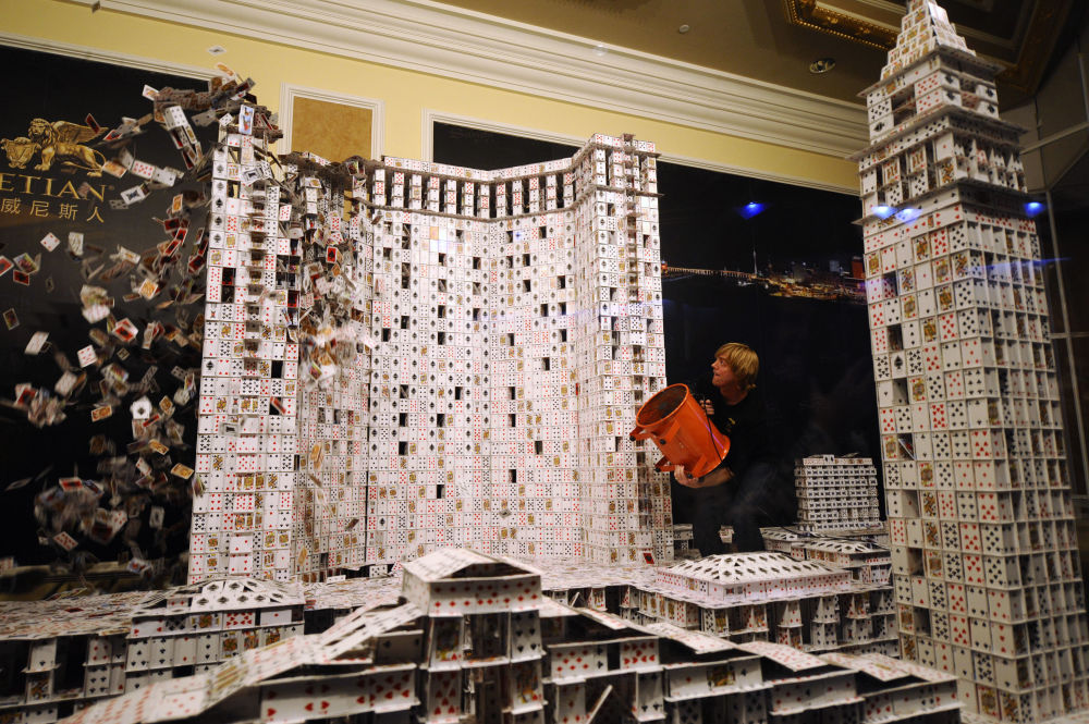 Ο Μπράιαν Μπεργκ την ώρα που καταστρέφει το δημιούργημά του: Ένα καζίνο και ξενοδοχείο στο Μακάου, φτιαγμένο από τραπουλόχαρτα.