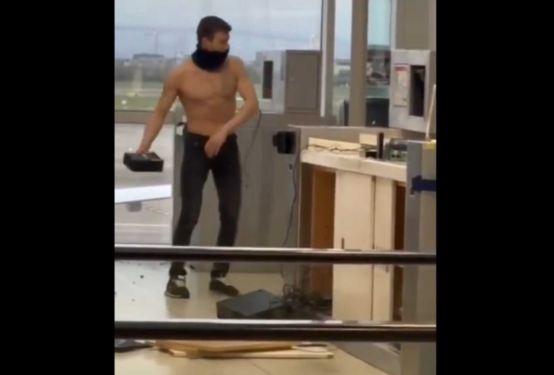 Πέταξε καρέκλες και τραπέζια από καφετέρια κοντά στις πύλες επιβίβασης, και προσπάθησε να κόψει καλώδια. Επιχείρησε να αποσπάσει ένα μεγάλο μεταλλικό κουτί από την βάση του προτού το πετάξει με δύναμη στο έδαφος.