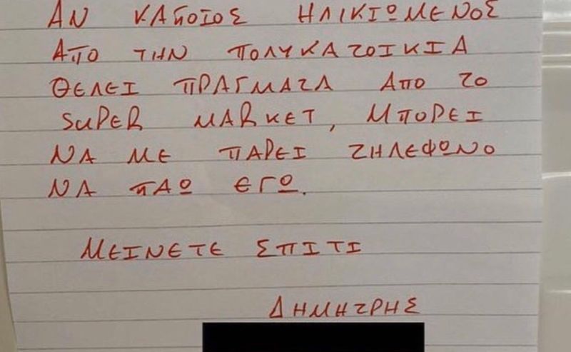 Η ανακοίνωση ενός διαχειριστή που έγινε viral στο διαδίκτυο ενημερώνει τους ηλικιωμένους ένοικους της πολυκατοικίας ότι ο ίδιος προσφέρεται να βγει στην αγορά για όσα χρειάζονται ώστε οι ίδιοι να μείνουν σπίτι τους και να προστατευθούν!
