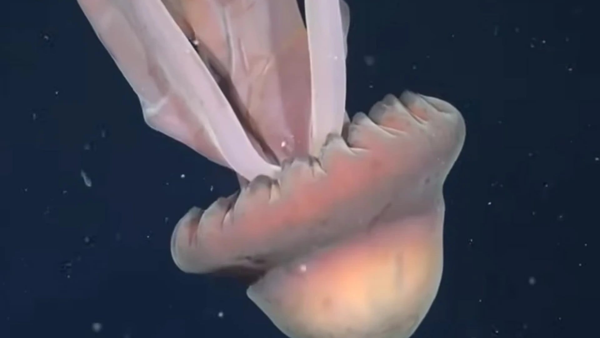 Στο βίντεο της γιγαντιαίας φαντασμομέδουσας, διακρίνονται νεαρά ψάρια να κολυμπούν δίπλα στα πλοκάμια της, τα οποία μοιάζουν με μακριές, ροζ κορδέλες που κατεβαίνουν απαλά μέσα στη θάλασσα. Σύμφωνα με το Schmidt Ocean Institute, οι σπάνιες αυτές μέδουσες δεν διαθέτουν κνιδωτικά πλοκάμια, αλλά χρησιμοποιούν τα μακριά τους άκρα για να συλλαμβάνουν τη λεία τους.