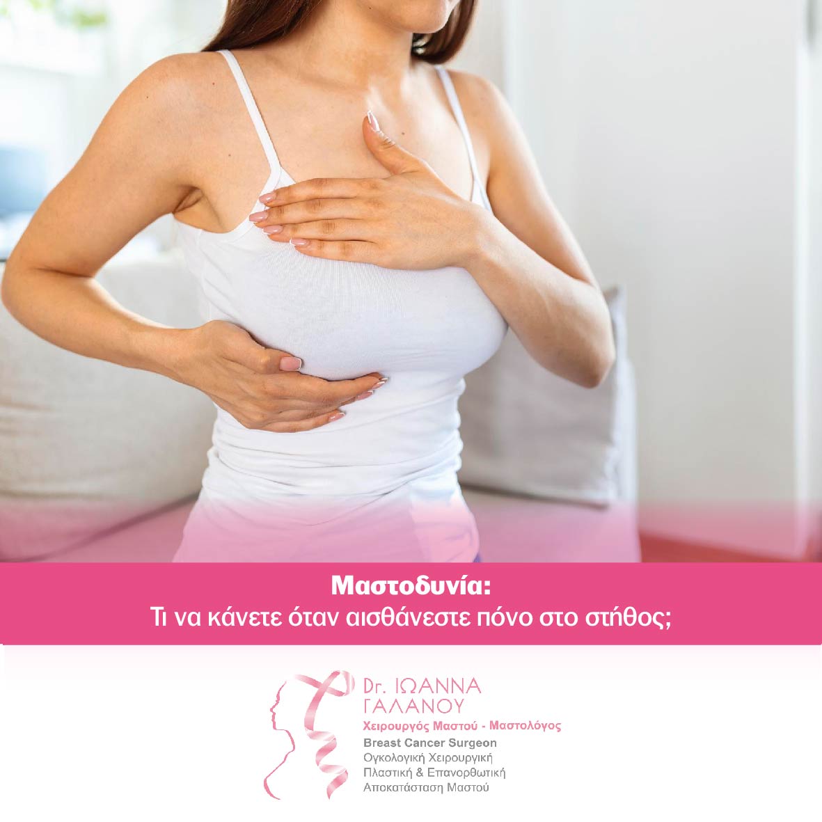 Η μαστοδυνία, γνωστή και ως μασταλγία, είναι η αίσθηση πόνου στον έναν ή και στους δύο μαστούς. Πρόκειται για ένα σύνηθες σύμπτωμα, καθώς περίπου το 70% των γυναικών μπορεί να βιώσει τουλάχιστον ένα επεισόδιο μαστοδυνίας κατά τη διάρκεια της ζωής τους. Ο πόνος αυτός προκαλεί συχνά έντονο άγχος και αποτελεί μία από τις κύριες αιτίες που ωθούν τις γυναίκες να αναζητήσουν ιατρική συμβουλή από έναν εξειδικευμένο Μαστολόγο- Χειρουργό Μαστού, αναφέρει η Δρ. Ιωάννα Γαλανού.